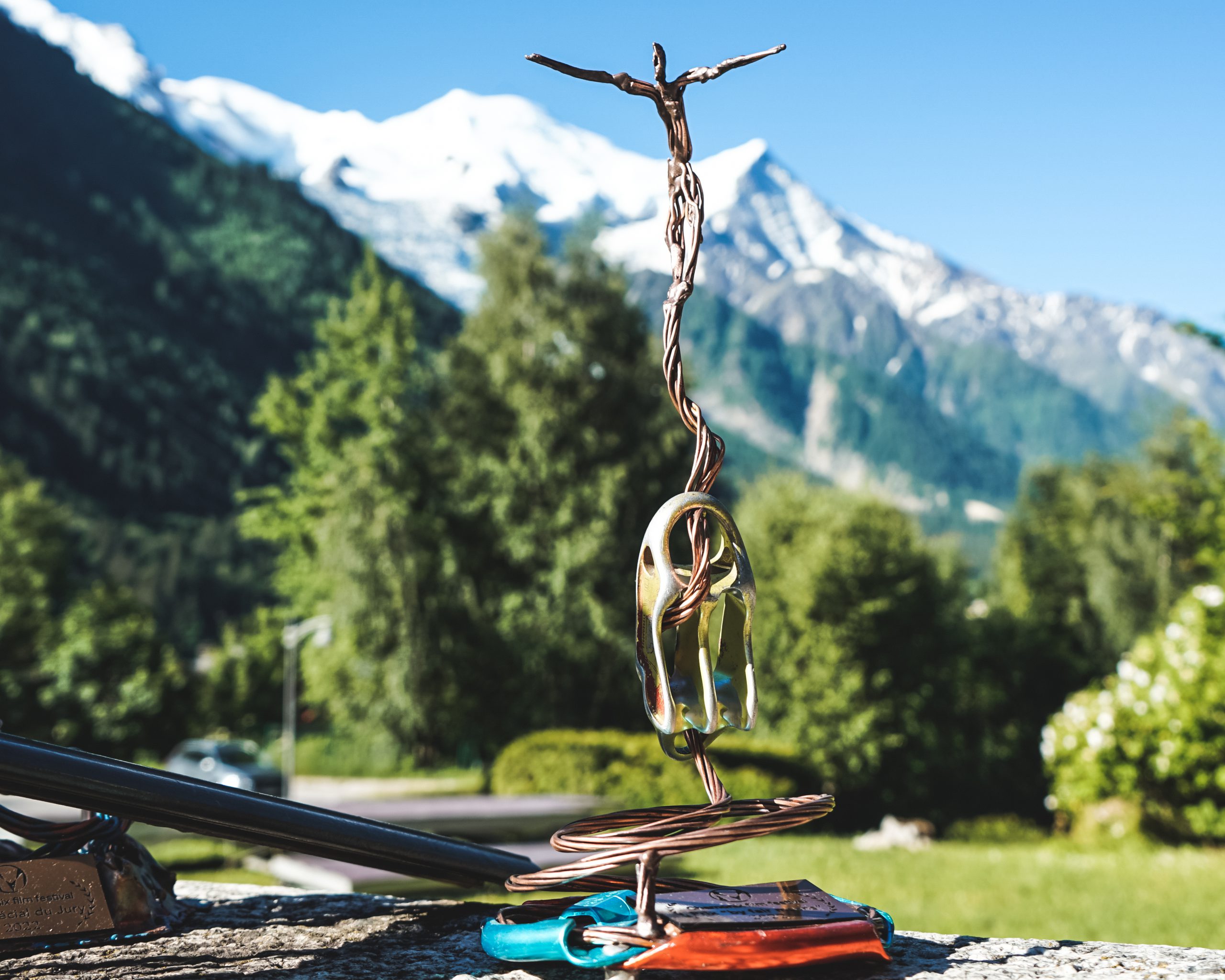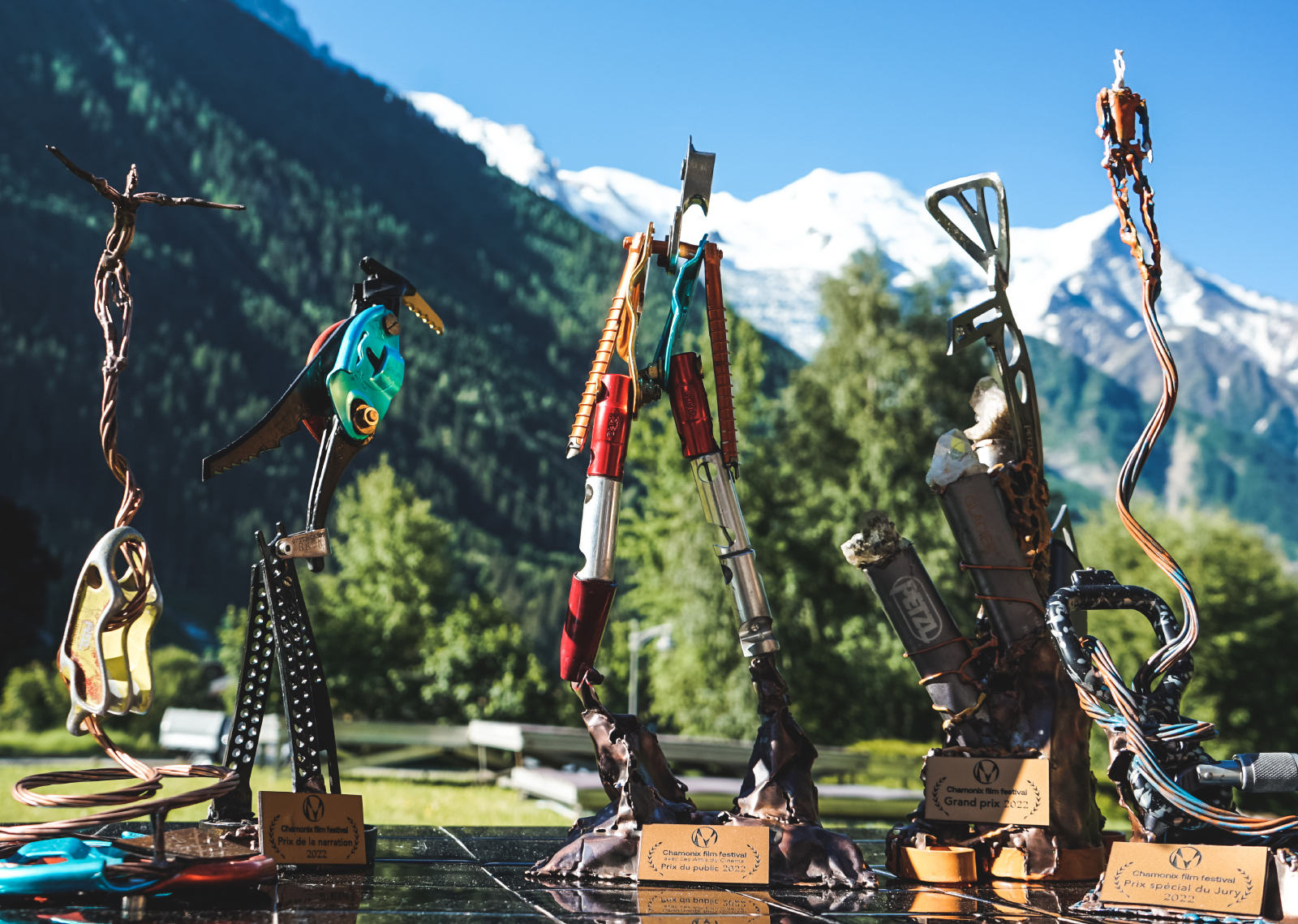 Les trophées sont des œuvres originales réalisées par le célèbre artiste et alpiniste Andy Parkin, à l’aide de vieux matériel d’alpinisme fourni par notre partenaire Petzl, lames de piolet, crampons, parties de mousquetons, outillages plastiques… Lorsque la création artistique rejoint l’esprit de l’alpinisme. Un immense merci à lui !